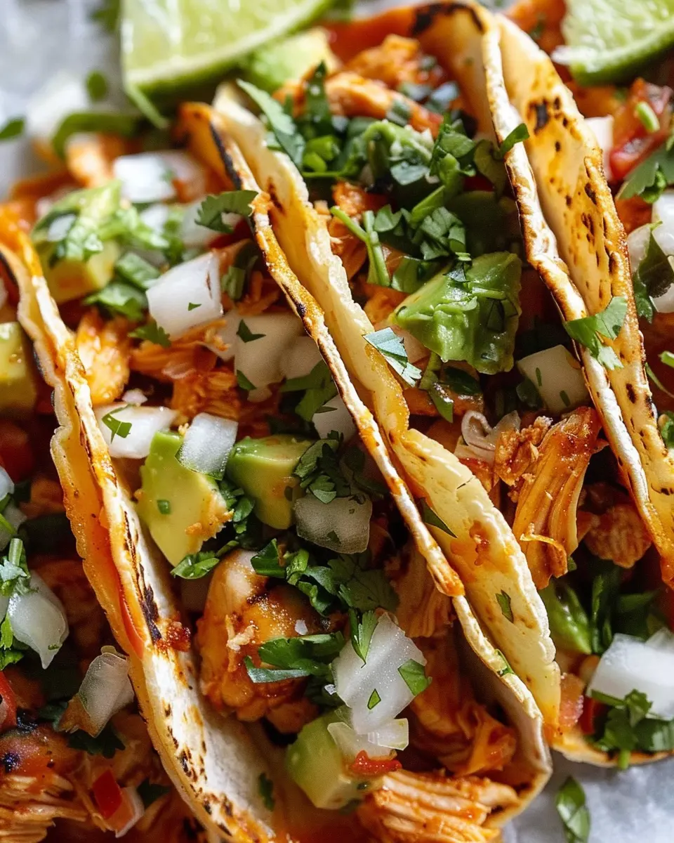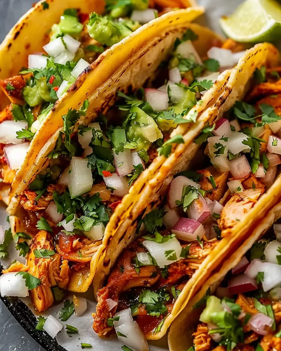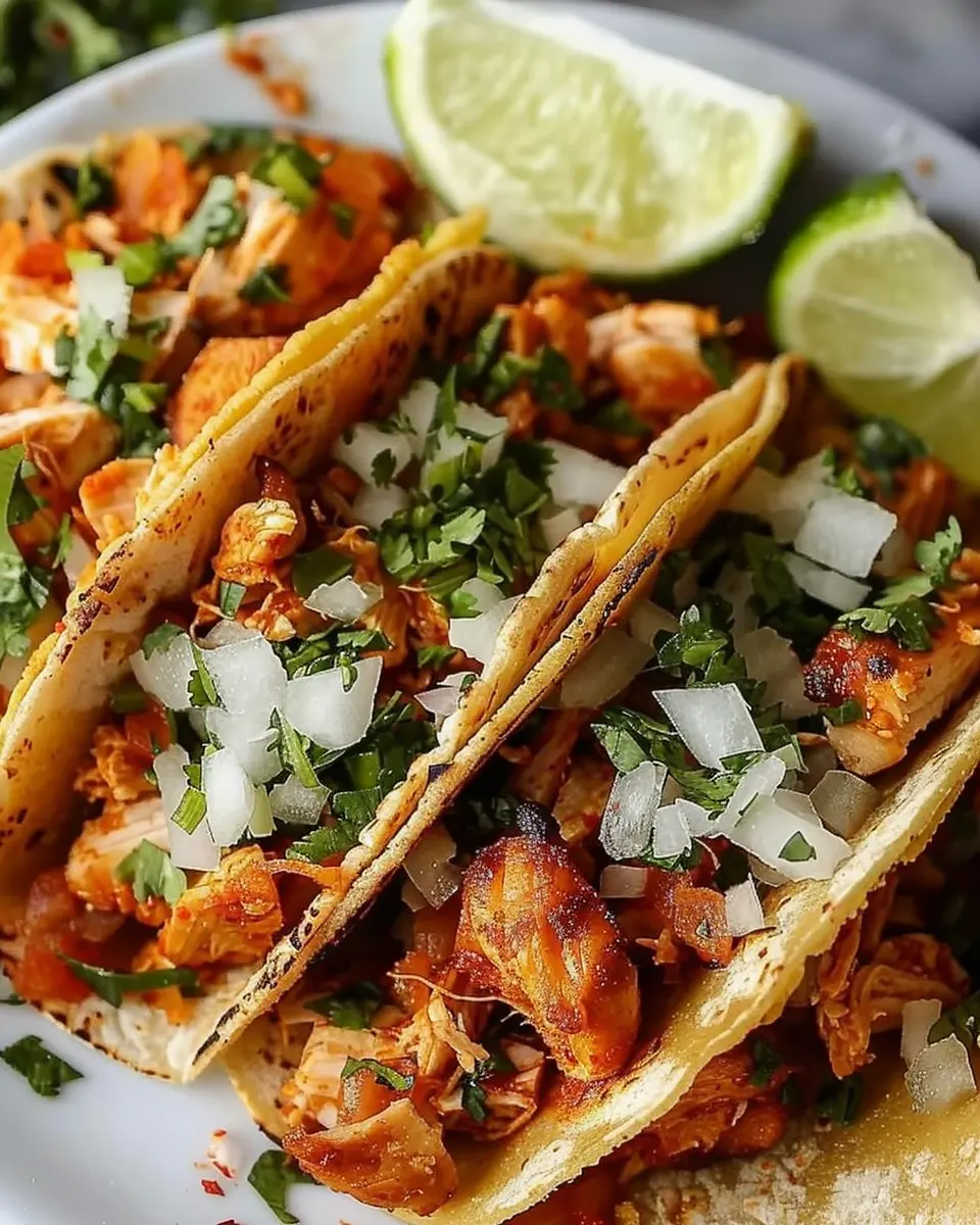 - Shred the chicken and assemble the tacos with onions, cilantro, and a squeeze of lime.