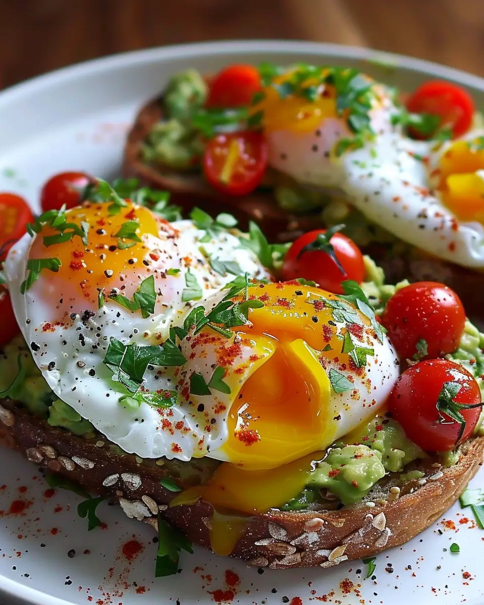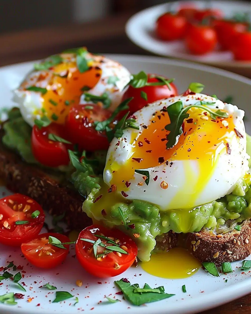 A delicious recipe for creamy avocado toast, topped with perfectly poached eggs and fresh cherry tomatoes.