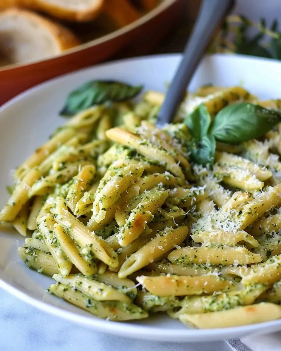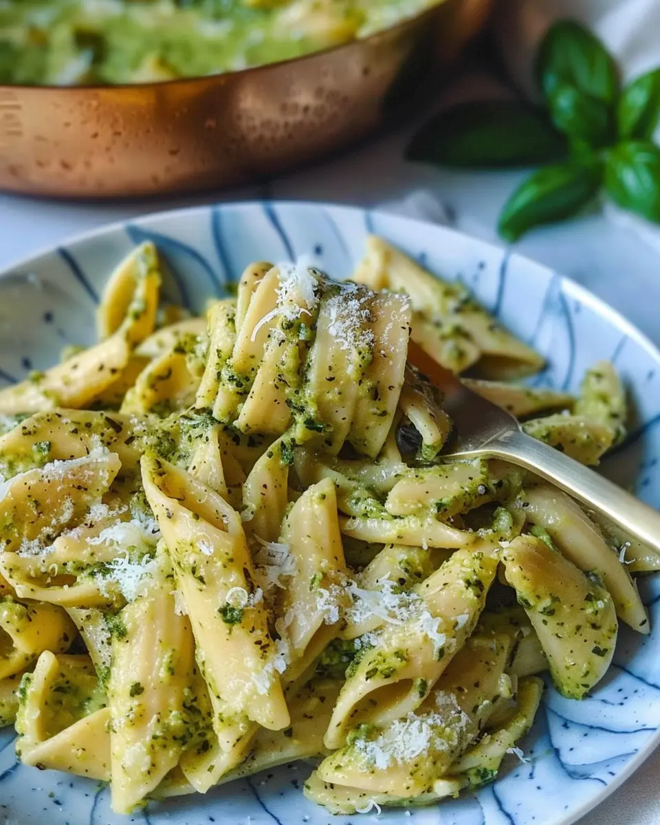 A deliciously creamy and flavorful pesto pasta that you can whip up in no time, perfect for a quick indulgent meal.