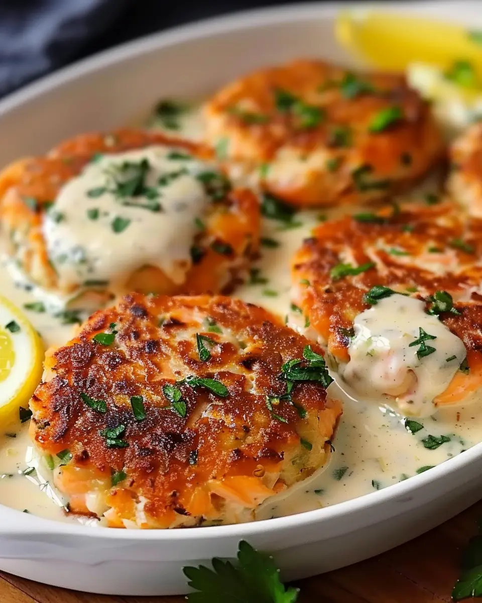 Delicious and easy-to-make salmon patties served with a creamy lemon-garlic sauce.