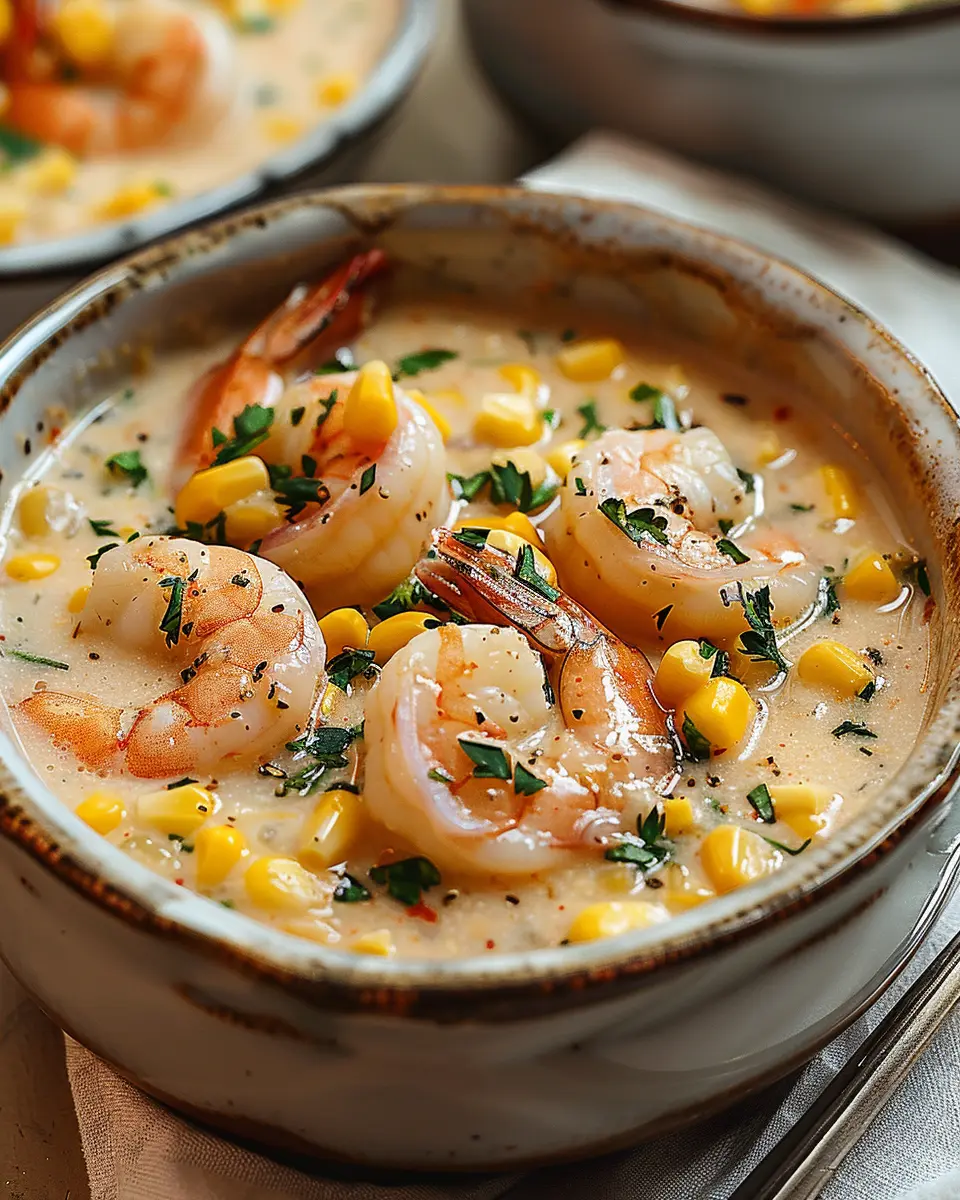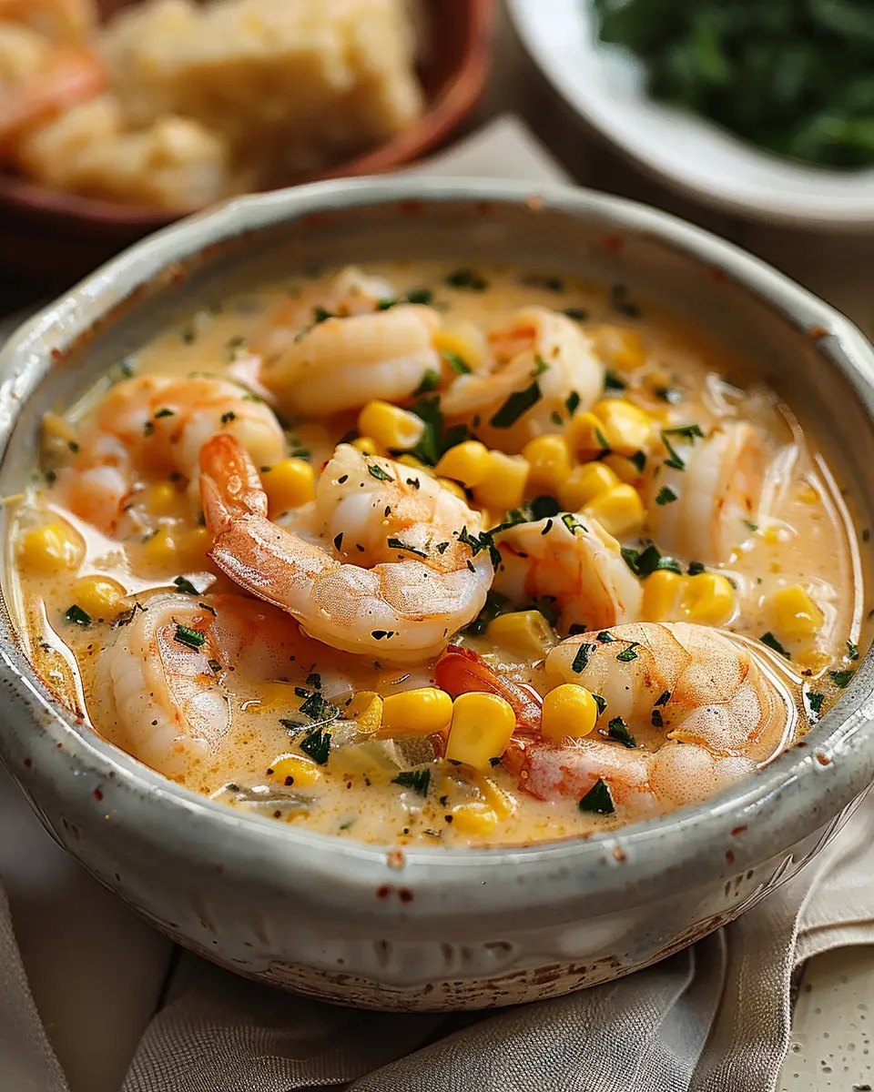 This shrimp and corn chowder is a creamy, indulgent dish that combines fresh shrimp with sweet corn for a comforting meal.