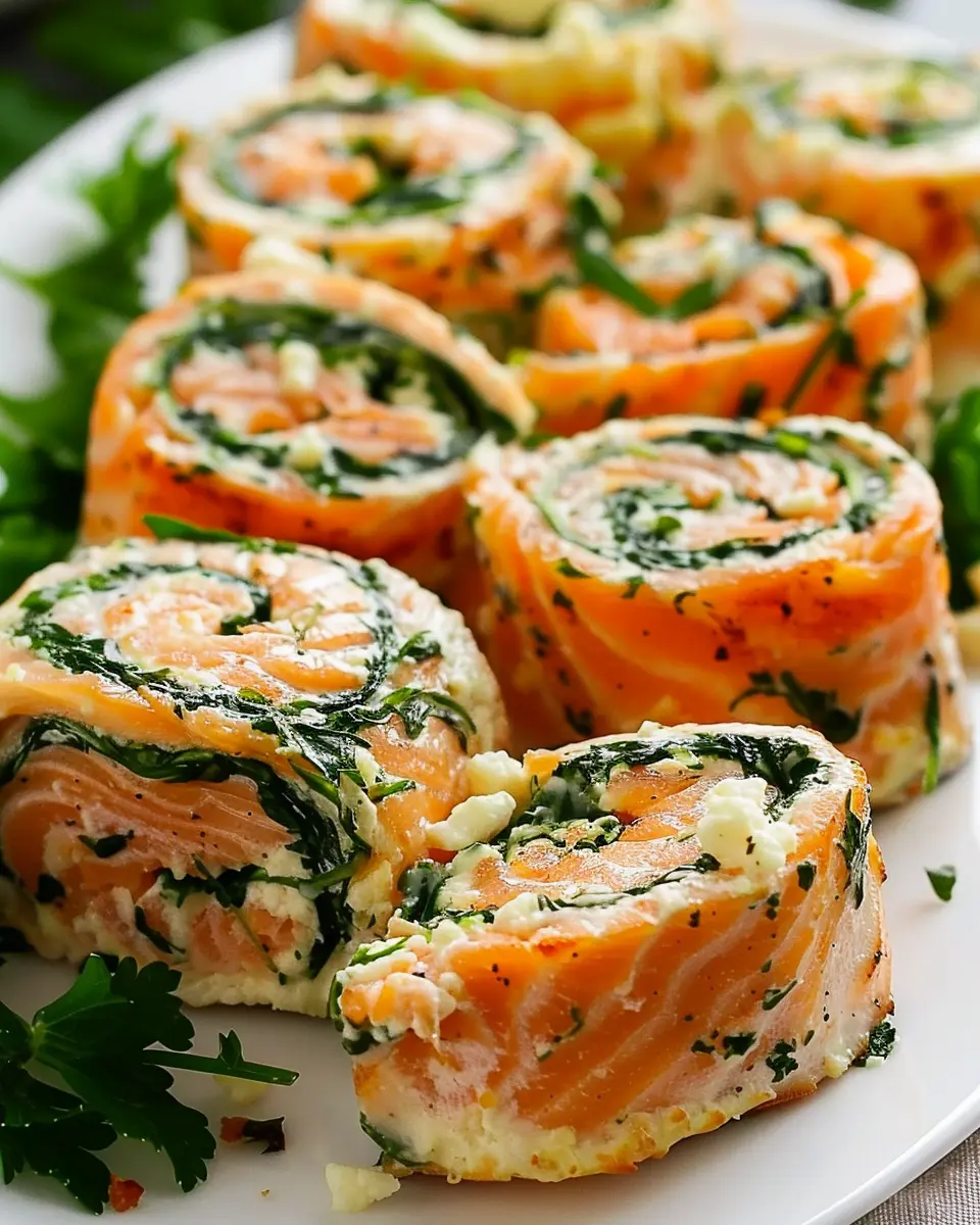 When it comes to presentation, you can elevate your Spinach & Feta Stuffed Salmon Pinwheels into a show-stopping dish. Try slicing them into beautiful spirals and arranging them on a platter with a drizzle of balsamic glaze. Or, serve them alongside a fresh herb and lemon yogurt sauce for dipping.